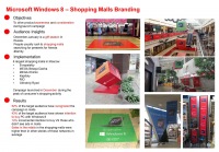 | Description | Microsoft launched Windows 8 by introducing a new era of no compromise devices and experiences The main goal of advertisement campaign was to drive product awareness and consideration during Windows 8 Launch in Russia The main challenge: to be bold and visible while big out of home formats are forbidden in Moscow. Need to find assets with the same power of influence that will be close to retailers December-January period is the gift season in Russia. People usually rush to shopping malls searching for presents for friends & family Idea: high impact non-standard placements in the largest shopping malls in Moscow |