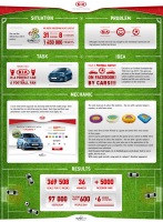 | Описание | KIA был официальным партнёром EURO-2012. Мы наблюдали лого KIA 31 матч подряд на всех 8 стадионах и на каждом билете. Впрочем, этого оказалось недостаточно для создания эмоциональной связи между футболом и брендом. Задача Продемонстрировать, что KIA – идеальный автомобиль для футбольного болельщика. Решение Сыграть в футбол! В Facebook!! На автомобилях!!! Идея Собственный автомобильно-футбольный чемпионат «KIA Euro Cup 2012». Игровое приложение на Facebook-странице бренда, которое позволяло играть в футбол на автомобилях KIA, с реальными противниками и в реальном времени. Механика Пользователь заходил в приложение и знакомился с модельным рядом KIA. Затем выбирал автомобиль – он становился его игроком. У каждой модели были свои параметры: одна – более мощная, другая – более маневренная, и так далее. Дальше нужно было выбрать стадион – тот, на котором больше игроков или тот, на котором меньше. Соперником мог стать любой пользователь, который был на тот момент в приложении. Количество одновременных участников матча было неограниченным. И вот начиналась игра. Как и в футболе, нужно было забивать голы, но автомобилем. Каждый забитый гол отображался на стене игрока в виде поста. Пользователи могли приглашать в игру друзей и хвастаться своими результатами у себя на страницах. И, конечно же, выигрывать призы – билеты на матчи EURO-2012. Результаты За 12 недель игроки забили 369 508 голов 36 победителей побывали на разных матчах принимающих городов EURO-2012 в Украине и Польше. Украинская страница KIA в Facebook получила +5000 фанов. На время игры страница увеличила среднее ежедневное количество контактов с потребителями в 156 раз и достигала 97 000 людей в день. Ежедневный вирусный охват вырос в 7-9 раз. Ежедневный показатель Talking About стал в 10 раз больше, чем до игры, и достигал более 600 упоминаний. Количество ежедневных посетителей страницы на время игры выросло в 6 раз. |