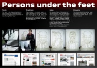 | Описание | Проблема - в последние годы в Екатеринбурге появилась тенденция: люди становятся бездомными в возрасте 70-80 лет по причине того, что их собственные дети и родственники выгоняют из дома. Ранее, в 90-х годах, по большей части, на улицах оказывались люди, освобожденные из мест заключения. Задача - привлечь внимание к проблеме бездомных в Екатеринбурге и деятельности благотворительного фонда "Небо". Мы сделали фотографии бездомных людей Екатеринбурга. Эти фотографии были нанесены на холсты прозрачной клейкой лентой. Затем, холсты разместили в городе в местах массового скопления людей – вокзал, кинотеатр, подземный переход. Люди, не замечая, проходили по этим холстам, тем самым оставляя на них следы, за счет чего со временем проявлялся портрет. Затем портреты были выставлены по городу. Не всё, что лежит под ногами – грязь. По итогу акции портреты были установлены по городу. |