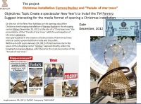 | Описание | В преддверии новогодних праздников в день открытия подвесной инсталляции новогодней елки от Ferrero Rosher в ТЦ Глобус 20 декабря 2012 года на площадке под «елкой» состоялась презентация проекта «Парад звездных елок» с участием украинских селебретис. Звезды приняли участие в создании и украшении авторских звездных елок и представили их СМИ и публике. В течение месяца (до 20 января 2013 года) звездные елки в пространстве ТЦ «Глобус» экспонировались непосредственно под подвесной елкой Ferrero Rosher, ставшей главным украшением проекта «Парад звездных елок». |