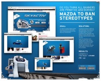 | Опис | Задача: Рассказать целевой аудитории об уникальной технологии SKYACTIV, перевернувшей представления о привычных характеристиках автомобиля. Решение: Баннер-приложение, в котором, в формате двенадцати анимированных интерактивных роликов, мы собрали самые популярные стереотипы и заблуждения. Пользователям предлагалось проверить насколько они доверяют стереотипам, а также развеять их с помощью специальной виртуальной машины. Кроме развенчания обычных стереотипов, пользователи узнали, что мощный двигатель не должен расходовать много топлива, автоматическая трансмиссия может «думать» быстро, а легкость кузова не влияет на его прочность. |
